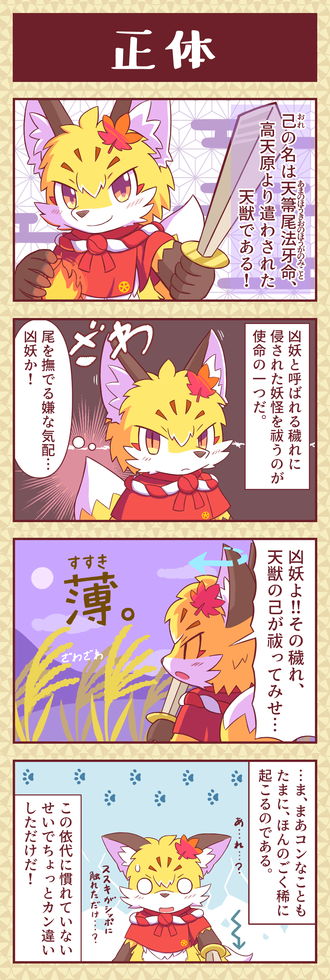 「聞くがよい!己おれこそは大神、月縄巡姫神つきなわめぐりひめのかみに仕える神使にして天獣、天箒尾法牙命である!」 神格:天狐(狐の天獣) 通り名:法牙ほうが/コン太 高天原で修行に明け暮れる子ギツネ。 世界を平定する使命を帯びた『天獣』と呼ばれる神使であり、 うつし世の穢れを祓うべく依代を用いて中津国に降り立つ。 正義感が強く真面目だが、中津国に向かうのは初めてであり慣れない生活に調子を狂わされることも。